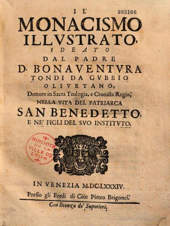 Il monacismo illustrato, ideato dal padre d. Bonaventura Tondi da Gubbio Olivetano, dottore in sacra teologia, e cronista regio, nella vita del patriarca san Benedetto e ne’ figli del suo instituto, Venezia 1684. Presso gli eredi di Gio. Pietro Brigonci. I brani citati sono tratti dal Capitolo VIII del Libro Terzo, «Dei pregi segnalati della Religione Benedettina», pp. 160-67.