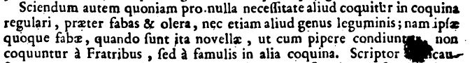 Mi appoggiavo anche alla studiosa francese, che, commentando quel passo, scrive: «Les fèves étaient servies avec du poivre et donc apprêtées par les serviteurs laïques (famuli) dans l’”autre cuisine” (alia coquina)».