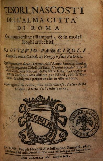 ♦ Ottavio Panciroli, Tesori nascosti dell’alma città di Roma con nuovo ordine ristampati & in molti luoghi arricchiti, Roma, per gli eredi di Alessandro Zannetti, 1625, pp. 429-30.