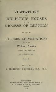 La visita al priorato delle monache di Catesby, dell’ordine di Cîteaux, della diocesi di Lincoln, celebrata nella sala capitolare il 17 luglio dell’anno del Signore 1442, dal reverendo padre in Cristo e Signore, Lord William, per grazia di Dio, vescovo di Lincoln, nel sedicesimo anno della sua consacrazione e nel sesto del suo trasferimento.