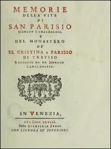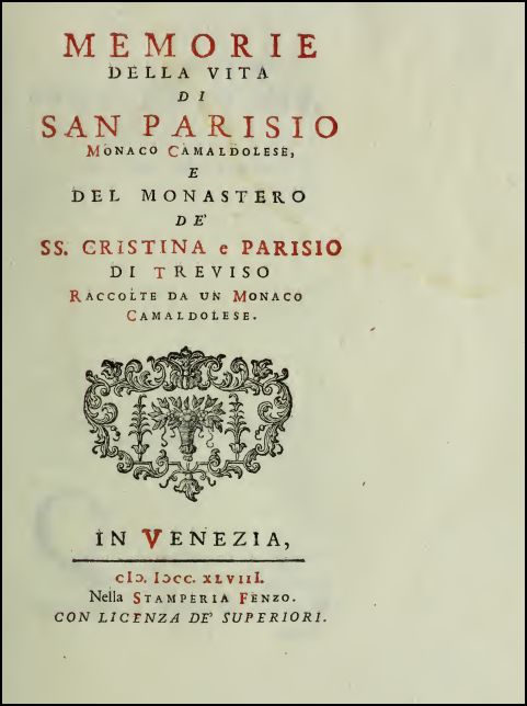♦ Memorie della vita di S. Parisio, monaco camaldolese, e del monastero de’ SS. Cristina e Parisio di Treviso, raccolte da un monaco camaldolese, in Venezia, 1748, nella Stamperia Fenzo.