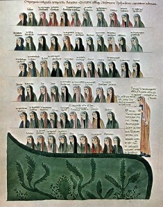 La mia preferenza, tuttavia, va a una miniatura di cui, ahimè, non sono in grado di indicare la fonte e che illustra la copertina di Camaldoli e l’ordine camaldolese dalle origini alla fine del XV secolo (a cura di C. Caby e P. Licciardello, Badia di Santa Maria del Monte di Cesena 2014). Il santo vi è raffigurato dormiente e seduto all’interno del recinto, formato dalla foresta, dell’eremo già costruito (magnifico il particolare di quello che interpreterei come sistema di distribuzione dell’acqua alle celle e ad altri due edifici). Dalla sua testa (se non dalla soglia dell’oratorio) parte la scala (mobile) sulla quale i monaci marciano a coppie, lo sguardo fisso all’apertura in alto dove la loro lunga attesa alfine si concluderà.